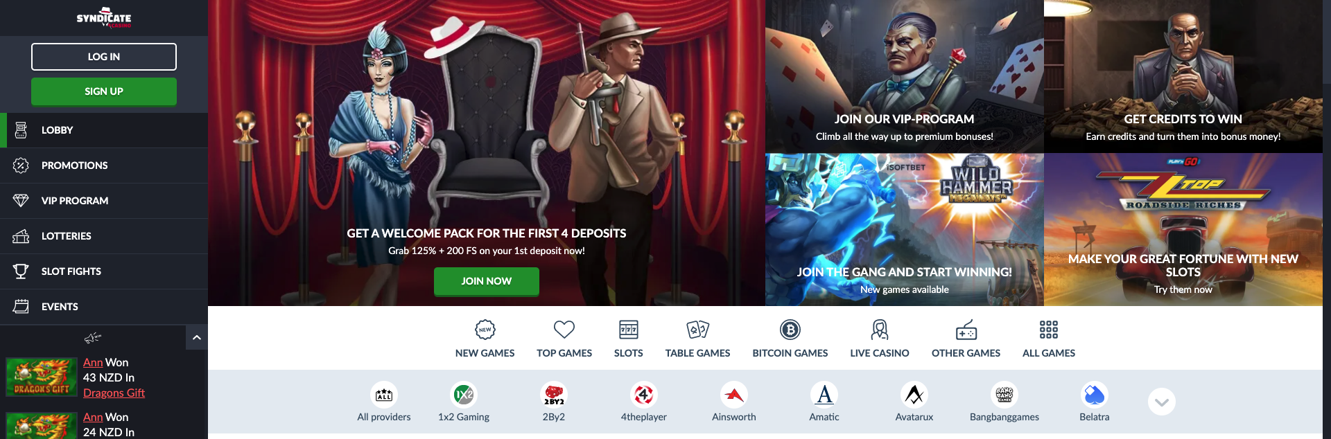 A mafia-themed online casino with stunning design and multiple games; Syndicate welcomes all Aussie players with A$1,000 in match deals and 200 free spins! Link your Bitcoin wallet and deposit in an instant to compete with the bosses over at Syndicate!