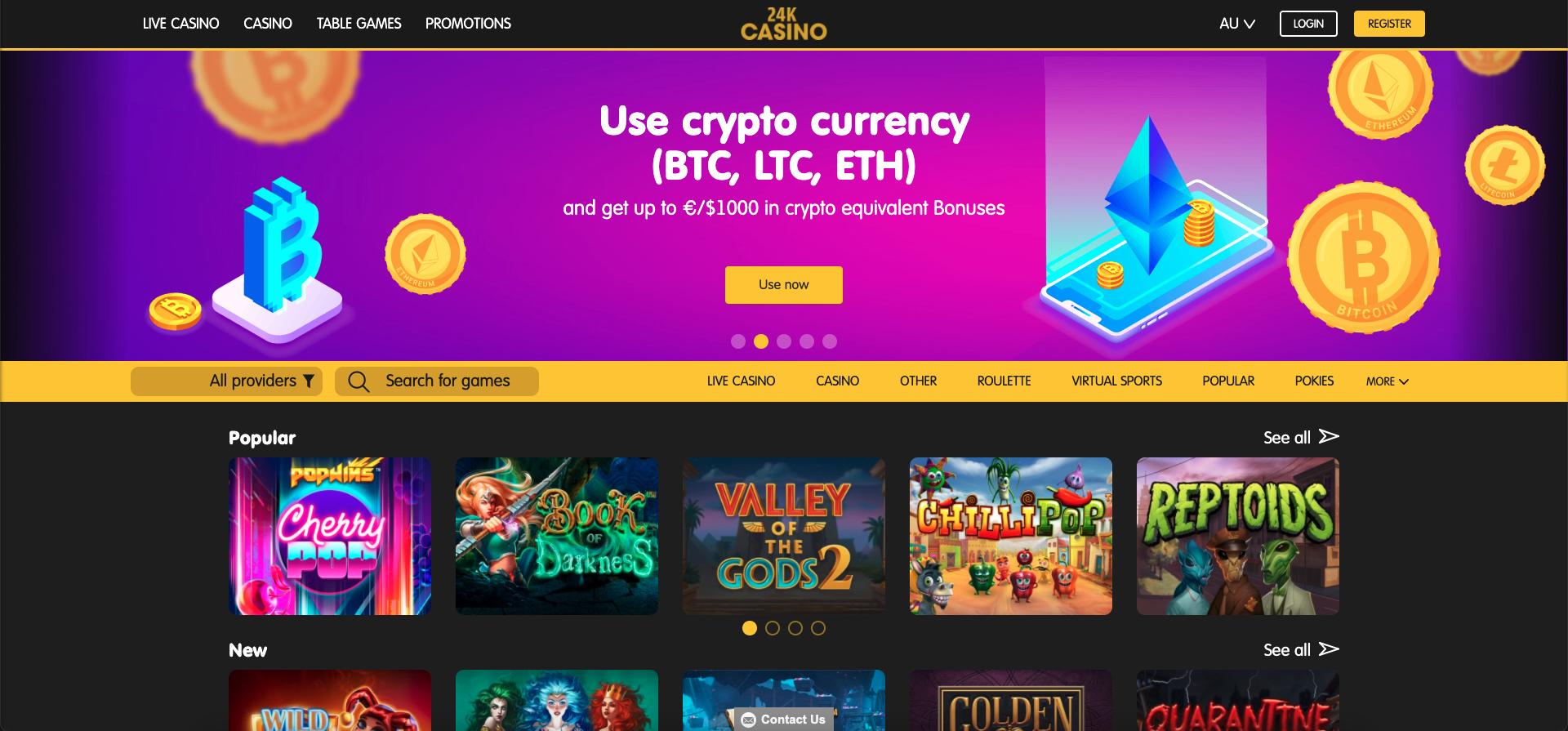 Tether, Ethereum, Bitcoin Cash and Bitcoin are all among the payment methods that you can employ to access over 2,500 games of chance at 24k Casino. It is a completely safe casino site with numerous positive reports by players, providing A$300 and 50 free spins to all new depositors!