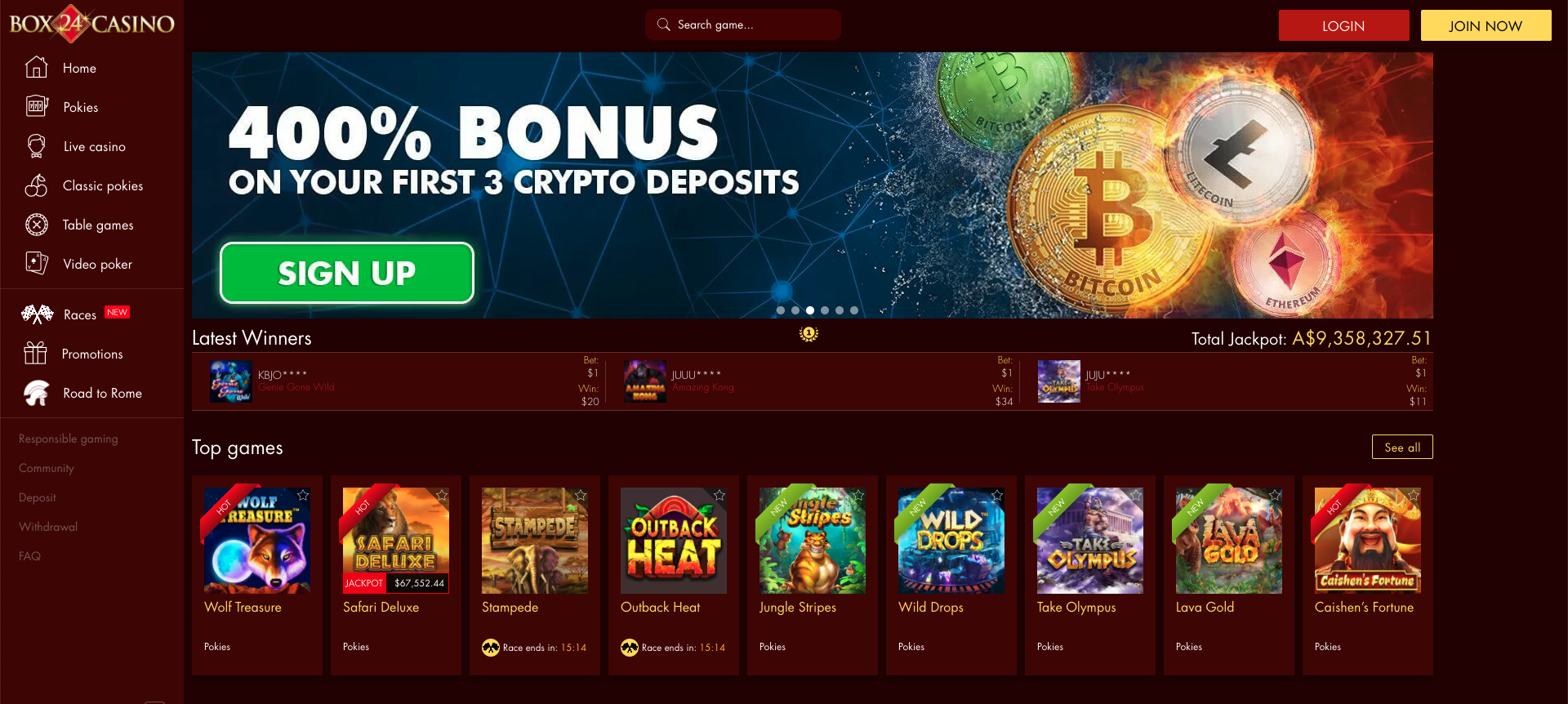 Box24 is a less known crypto casino operating in the US and Australia. If you fancy Betsoft and Pragmatic Play slot games, then this might be the best site for you. All players can also compete for exclusive prizes through the weekly tournaments available at Box24 BTC casino.