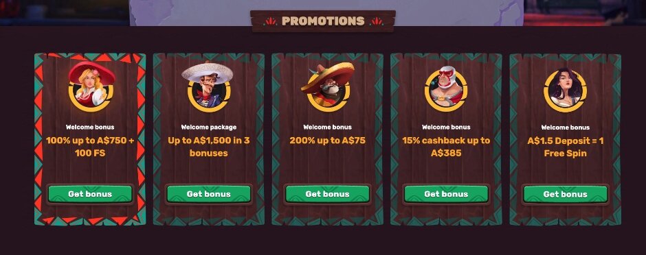 Note: Players complained about the various packages at 5Gringos, and we did our best to simplify the situation. Now, if you use our links to create an account at 5Gringos and make a A$50+ deposit three times, you can receive a 100% match up to A$1,750 + 50 free spins, a 50% match up to A$1,500 + 50 free spins, and a 75% match up to A$750 + 50 free spins. Meet the minimum deposit threshold to get a welcome package of A$4000 + 150 free spins as a new 5Gringo!