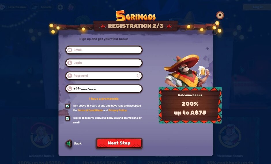 - The following form requires an email, login, password, and phone number. Ignore the promo code field since our links are enough to claim the 5Gringos casino bonus.