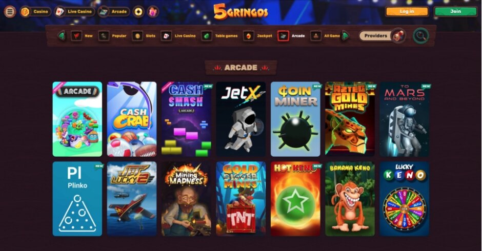 From Candy Crash look-alike games to fascinating quiz games, players can have fun while going after big money. 5Gringos Casino has even included fish table games and multiplayer arcade games in this section so that you can compete with others for the biggest prizes. The games come with 10,000x win multipliers, so the fun can also be rewarding.