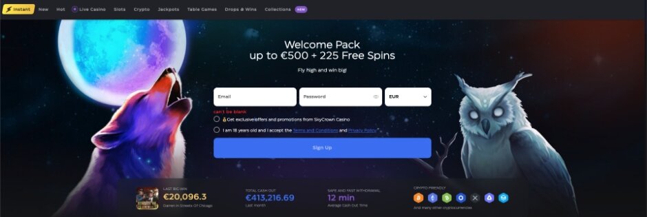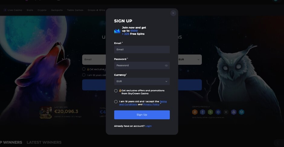 Registering a new account with SkyCrown Casino is simple. The form is instantly available from the home page center screen, requesting your email, password, and currency. Additional personal and address information will be required later, which must be verified to proceed with any cashouts from SkyCrown Casino.