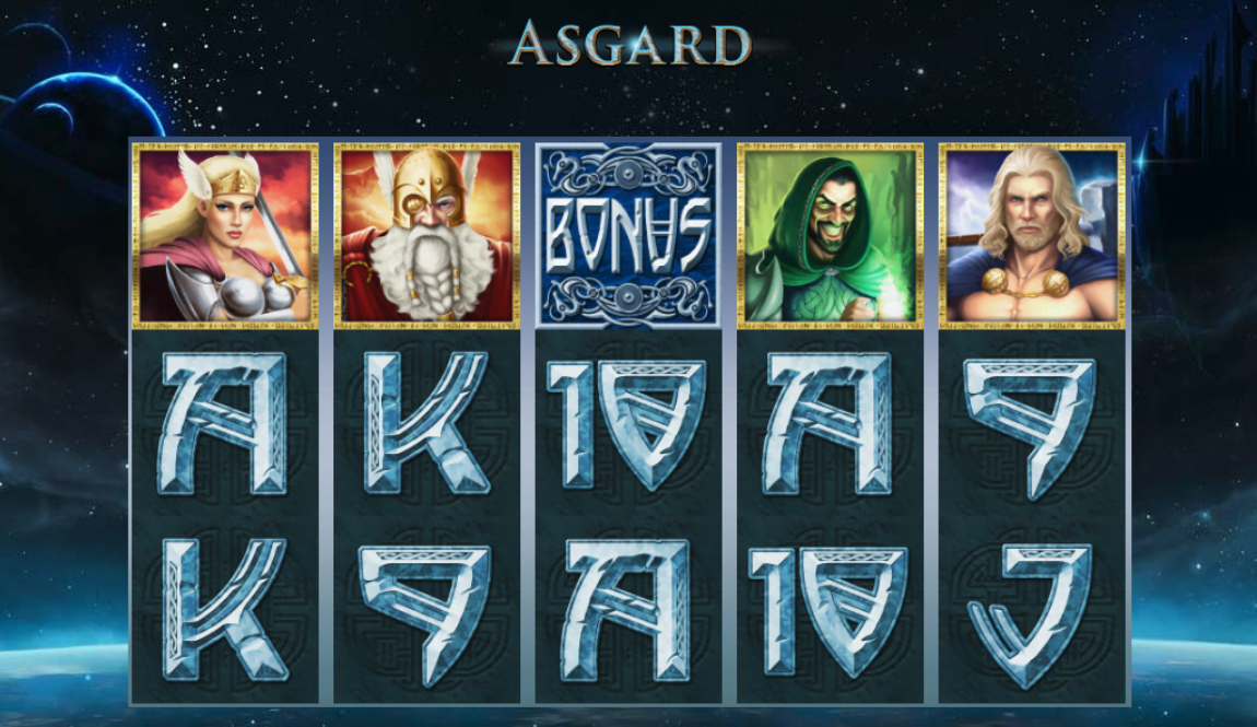 The five reels and three rows apparent in Asgard slot are a deep dark colour, set against a 3D image of the Universe, coloured by the moonlight. The symbols are all related to Norse Gods, with Thor, Loki, Mjolnir, Valhalla and their parents being the high paying symbols. The classic card symbols, 9 – A, are the low paying symbols in Asgard, coloured in a silver colour. All symbols are 2D, as RTG seems to have preferred a more classic outlook.