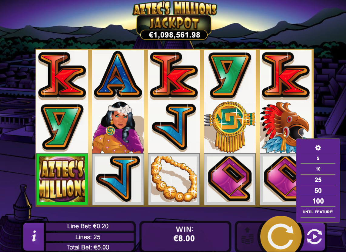The reels are a fitting white and gold colour, which contrast nicely with the purple background of an Ancient Egyptian city. If you decide to play Aztec Millions, you will probably agree with us that the best feature of the game are the vibrant sound effects that accompany each spin.