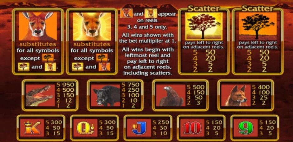 - Wilds – are represented by the Kangaroo itself, which can appear on the third, fourth and fifth reel only. When it does, it substitutes for all other symbols to help you form winning combinations with a single Kangaroo awarding free games. Each additional Kangaroo symbol during the bonus round will offer 5 extra spins.