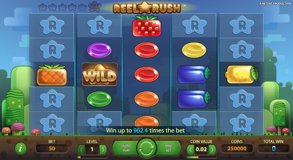 To save you the surprise, when you first see the Reel Rush game rows and reels, you will notice that many slots are covered with an R, but more on that below.