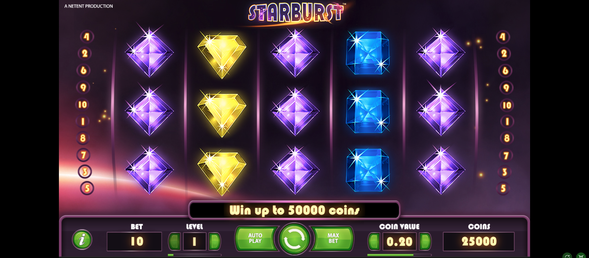Now, you can hit the Starburst play button or use the Autoplay to automatically spin the reels multiple times. To win, you must match 3 identical symbols on an active payline from left to right or vice versa. Alternatively, wilds can help you win as they substitute for all other symbols. If you land 4 identical symbols and a wild in the middle, then you will get the multiplier of 5x symbols.