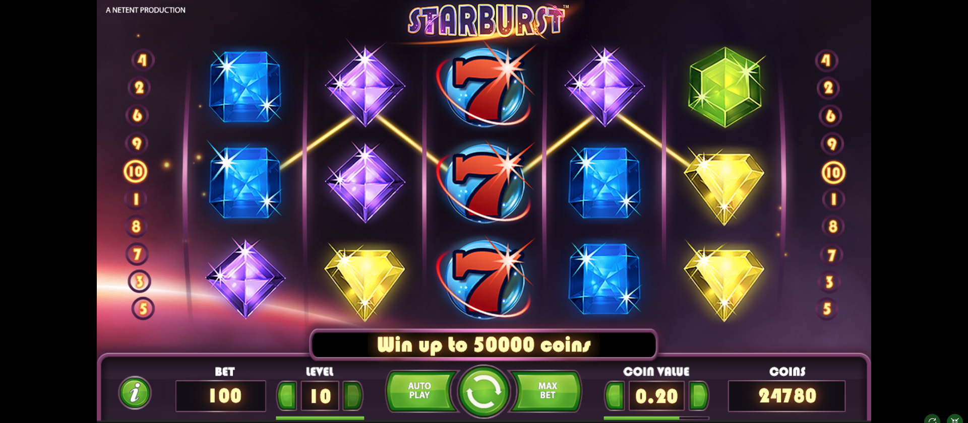 Starburst pokies machine is not your standard game, when it comes to how it is being played. When it comes setting paylines, the process is standard, as you just have to select between 1 – 10. We advise going for the max of 10, as it creates substantially more winning opportunities. When 10 paylines are active, the minimum bet is $0.10 per spin, and you can adjust it up to $100 using the (+) and (-) buttons.